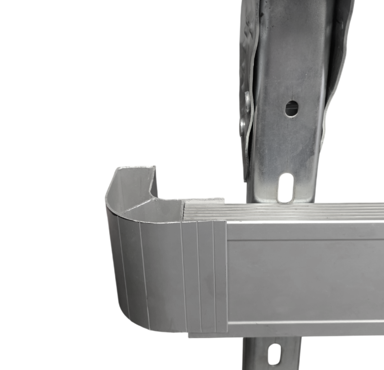 Конструкция боковой защиты представлена в виде высокопрочного профиля из алюминия, что крепится за счет держателей, выполненных из цинка. Боковая защита на полуприцеп состоит из алюминиевого профиля, вертикальных кронштейнов и пластиковых заглушек.